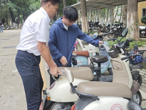 活动期间,志愿者耐心引导同学们将电动车停放在指定区域,避免堵塞道路或占用消防通道。对于未按规定停放的车主进行耐心劝说,提醒其乱停乱放的安全隐患,引导大家养成规范、有序停车的良好习惯。