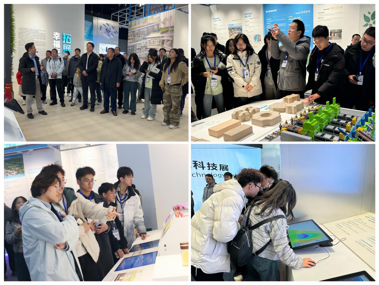 学院师生依次参观了共建和谐城市、拓展幸福空间和助力中国建造三大主题展区以及室外展区,同学们认真观看项目视频介绍,聆听技术和产品讲解,详细询问污水处理、生态环境治理、隔震减震、“好房子”建造、智慧运维、光伏发电和储能等领域的先进技术和创新做法,详细了解中建集团最新的建筑成果和在国家重点工程中的贡献,感受到了中建集团作为行业领军企业的责任与担当。