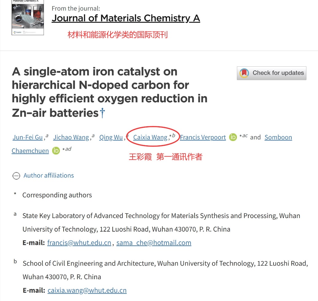 《Journal of Materials Chemistry A》是英国皇家化学会(Royal Society of Chemistry,简称RSC)下的一本旗舰期刊,是材料化学领域的权威期刊,专注于报道材料在能源和可持续性方面应用,以其严格的审稿标准和高质量的学术要求而闻名,影响因子为10.7。王彩霞老师的论文能够在此期刊上发表,不仅是对其研究成果的肯定,也是对澳门十大网投正规官网平台科研水平的国际认可。