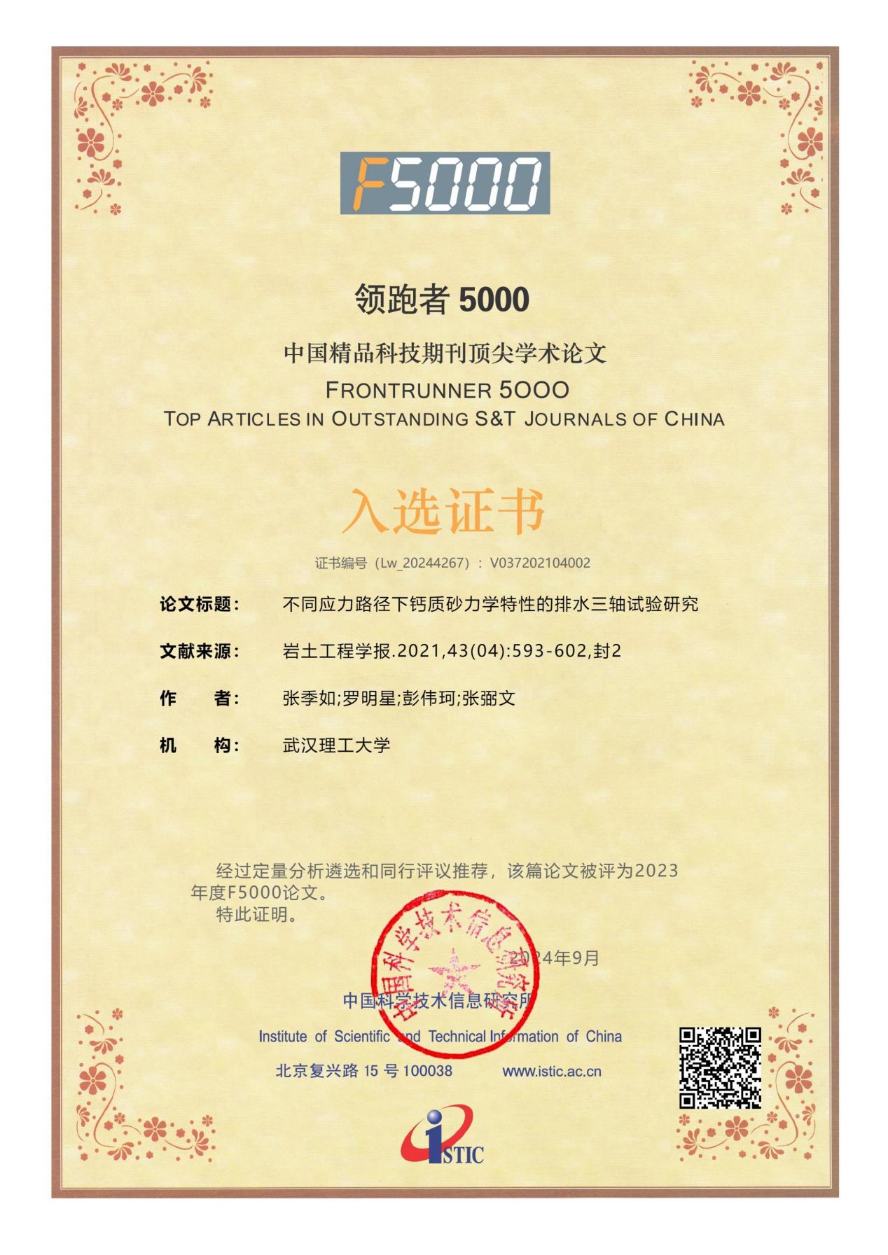 近日,国家科技部中国科学技术信息研究所(中信所)发布了2024年“领跑者5000—中国精品科技期刊顶尖学术论文(F5000)”的入选论文名单,十大网投正规官网张季如教授课题组发表在《岩土工程学报》2021年第43卷4期上的论文《不同应力路径下钙质砂力学特性的排水三轴试验研究》入选2023年度F5000,论文第一作者和通讯作者为张季如教授。该文对钙质砂开展了不同应力路径下的高压三轴试验,揭示了应力路径对钙质砂变形、强度和颗粒破碎的影响规律,并探明其在不同应力路径试验中的差异除了源于砂土应力路径依附性的特性外,还来自于颗粒破碎程度不同产生的影响。