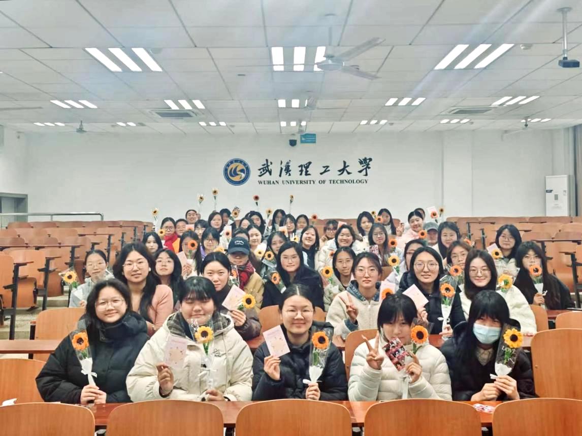 年级周课上,各年级辅导员将一朵朵向日葵送到女生手中,并以此花寄语大家,愿同学们在大学时光里心怀阳光、积极向上,勇敢追逐梦想,在学业与生活中绽放属于自己的光彩。现场氛围温馨,笑语盈盈,金黄的花朵映衬着女生们的青春面庞,成为节日里动人的画面。