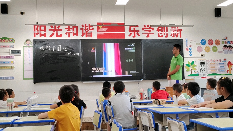 “祖国太棒了!”在观看香港回归影像后,学生们被祖国的强大深深震撼,发出感叹。课堂伊始,实践队员着重向学生介绍《我的中国心》的创作背景。实践队员借助多媒体放映香港回归的珍贵影像,提高学生的注意力,并简要介绍香港回归的时间与《我的中国心》创作目的,即希望香港回归祖国怀抱,渴望祖国统一与民族团结。通过这些方式帮助学生充分了解《我的中国心》。