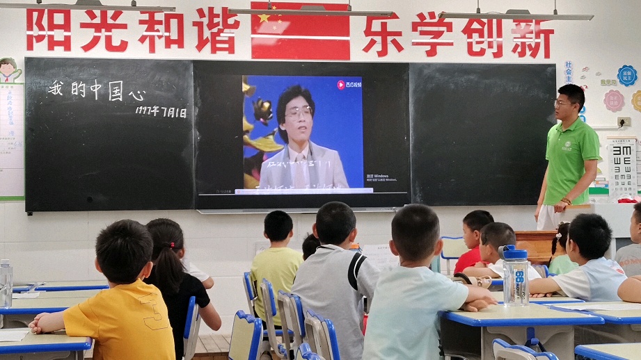 图为学生在实践队员的带领下合唱《我的中国心》(通讯员 付依涵 供图)