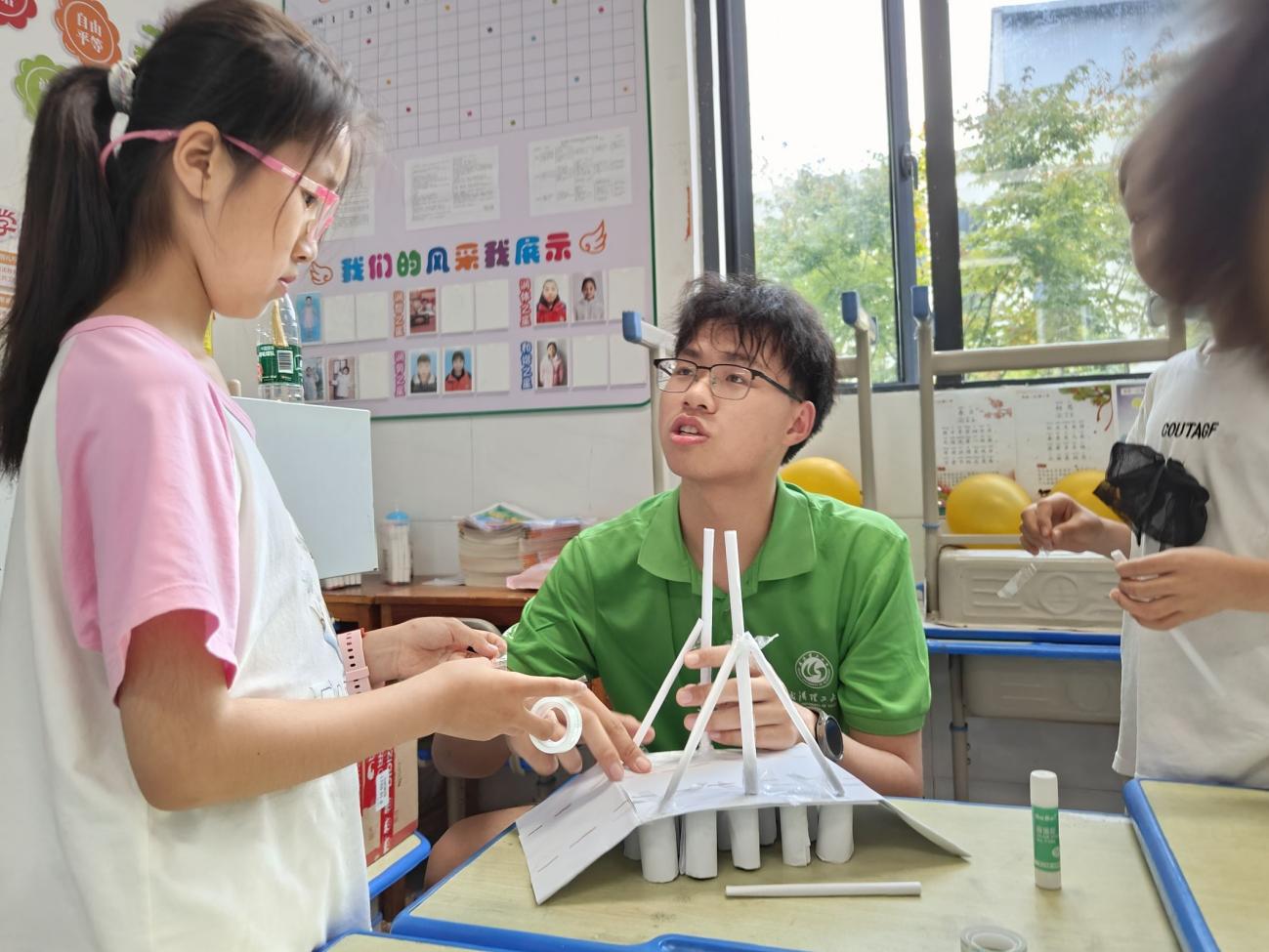 为营造科学氛围、普及基础科学知识,实践队员结合孩子们所学过的知识,用生动风趣的语言,从实际生活出发,为孩子们讲解了纸桥承重的基本原理并介绍了相关的桥梁基础知识。