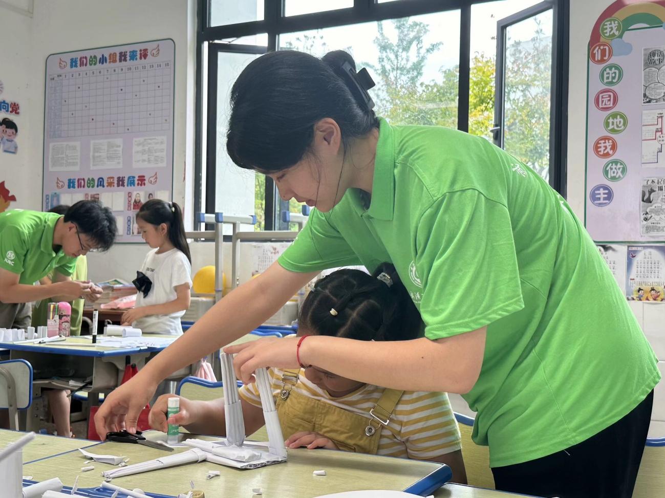 “老师,这个纸桥这么制作会结实一点吗?”一个四年级的小男孩拿着自己画的草图向实践队员询问到。老师向孩子们介绍完相关知识后,孩子们在实践队员们的指导和帮助下开始了纸桥的制作。孩子们将A4纸卷成长度粗细不同的纸棒,在实践队员们的指导下,利用固体胶和胶带,将一根根纸棒组装成了一座座小小的纸桥。起初,几个年龄比较小的孩子无法卷出比较结实的纸棒,导致搭建的纸桥结构不稳,难以承载重量。然而,在实践队员们耐心的讲解和亲身示范后,孩子们将课堂上学到的知识和自己的想象力结合起来不断试验和改进,孩子们制作的纸桥越来越牢固,承重能力越来越强。