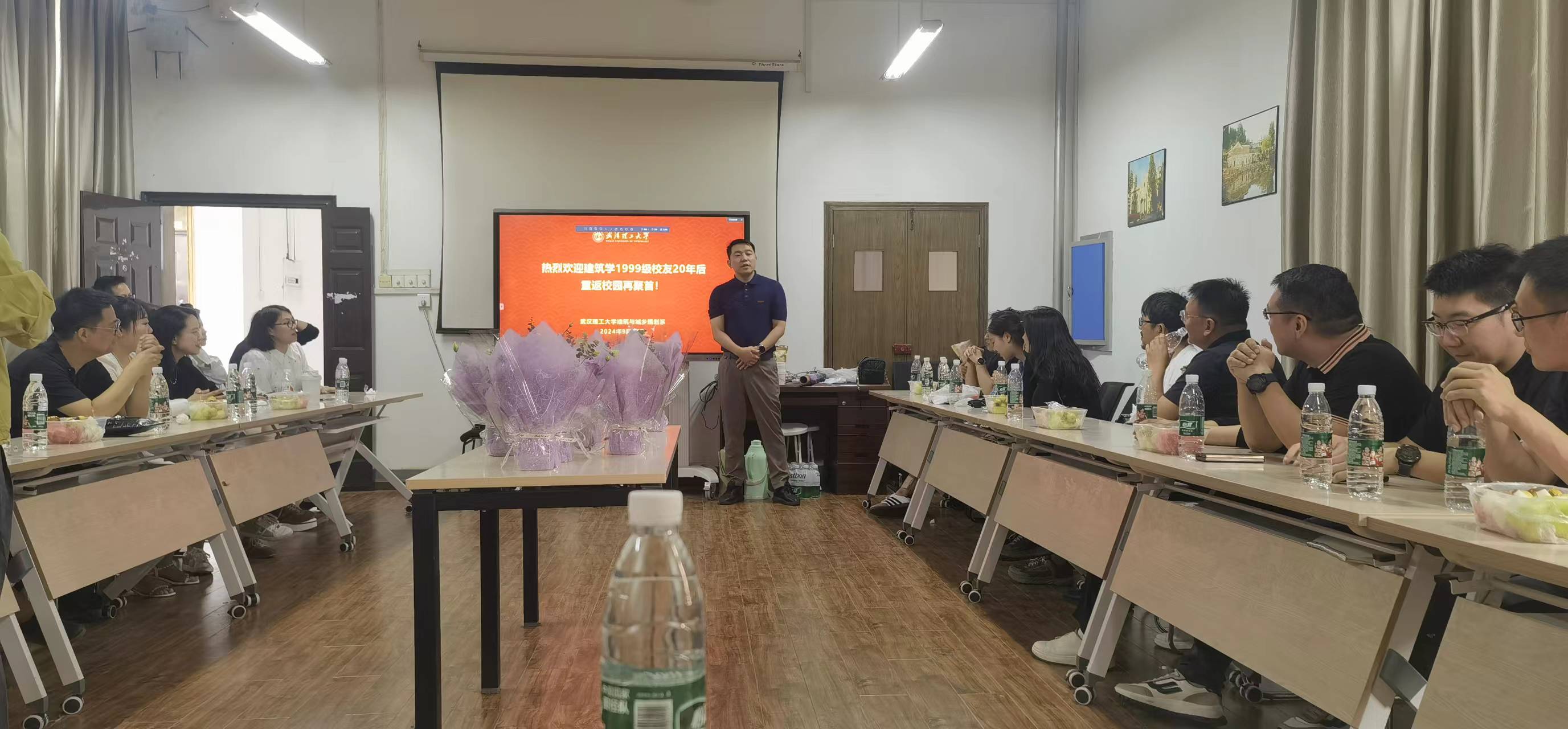 9月21日,建筑学99级30多位校友返回母校,在建筑馆专业教室302举行座谈会,并参观了建筑与城乡规划系展馆。建规系主任陈铭、副主任谢宏杰、班主任李英攀、校友办主任黄瑾及专业教师代表饶湘、杜文丽、刘红红等参加了校友返校活动。